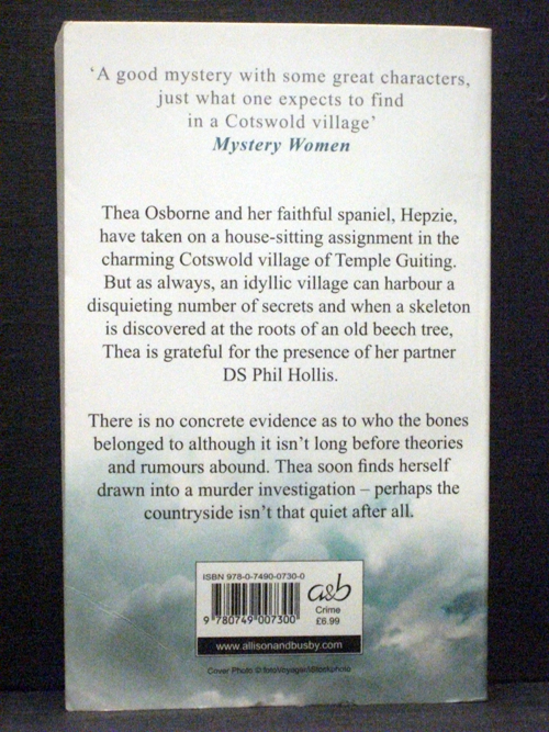Thea Osborne and her faithful spaniel Hepzie have taken on another house-sitting assignment this time in the very quiet village of Temple Guiting. Detective Superintendent Phil Hollis is looking forward to visiting for a night or two and celebrating the couple's one year anniversary but a slipped disk in Phil's back soon puts an end to their romantic weekend. As it turns out having a policeman on the scene is not entirely unnecessary in the little village. A few days into their stay a pile of human bones are discovered in the base of an uprooted tree. There is no concrete evidence as to whom the bones belonged to though the locals all have their theories and rumors abound. Thea and Phil find there is a strong connection to the Knights Templar in the village with most locals claiming to be descendants of some or other lineage. Temple Guiting turns out to have more than its fair share of secrets and Thea and Phil find their relationship tested to the limits as they try to prevent another murder investigation from threatening the quiet solitude they hold so dear.