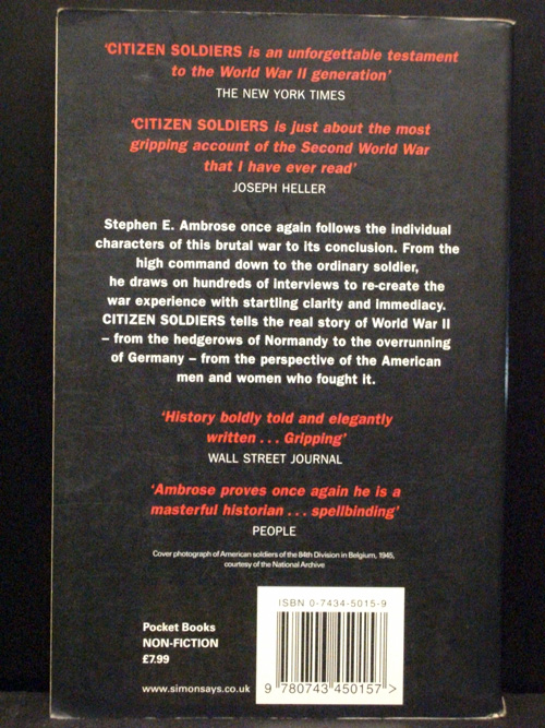 This sequel to D-DAY opens at 00:01 hours June 7 1944 on the Normandy Beaches and ends at 02:45 hours May 7 1945. In between comes the battles in the hedgerows of Normandy the breakout of Saint-Lo the Falaise gap Patton tearing through France the liberation of Paris the attempt to leap the Rhine in operation Market-Garden the near-miraculous German recovery the battles around Metz and in the Huertgen Forest the Battle of the Bulge the capture of the bridge at Remagen and finally the overunning of Germany. From the enlisted men and junior officers Ambrose draws on hundreds of interviews and oral histories from those on both sides of the war. The experience of these citizen soldiers reveals the ordinary sufferings and hardships of war. They overcame their fear and inexperience the mistakes of their high command and their enemy to win the war.