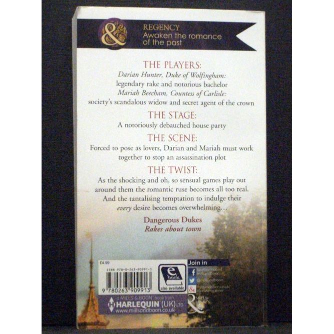 The Players: Darian Hunter; Duke of Wolfingham: legendary rake and notorious bachelor Mariah Beecham; Countess of Carlisle: society's scandalous widow and secret agent of the crown The Stage: A notoriously debauched house party The Scene: Forced to pose as lovers; Darian and Mariah must work together to stop an assassination plot The Twist: As the shocking and oh-so-sensual games play out around them; the romantic ruse becomes all too real. And the tantalizing temptation to indulge their every desire becomes overwhelming.. --> Genre: Harlequin Romance