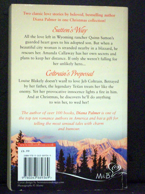 This title includes the two classic love stories by bestselling author Diana Palmer in one Christmas collection. "Sutton's Way" - All the love left in Wyoming rancher Quinn Sutton's guarded heart goes to his adopted son. But when a beautiful city woman is stranded nearby in a blizzard he rescues her. Amanda Callaway has her own secrets and plans to keep her distance. If only she weren't falling for her unlikely hero..."Coltrain's Proposal" - Louise Blakely doesn't want to love Jeb Coltrain. Betrayed by her father the legendary Texan treats her like the enemy. Yet her provocative innocence lights a fire in him. And at Christmas he discovers he'll do anything to win her to wed her!